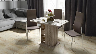 Столы изготавливаются из потенциально безопасных материалов (ДСП/МДФ) и соответствуют требованиям ГОСТ. К их преимуществам можно отнести надежность, устойчивость и ремонтопригодность. Фирменные конструкции обеспечивают комфорт во время приема пищи и легко вписываются в любые интерьеры.